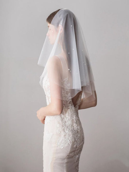 Simple Ivory Tulle Wedding Veil Waist Length with Pearls