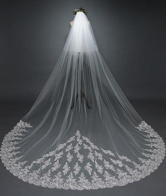 Ivory Cathedral Veils with Lace and Beaded Hemline