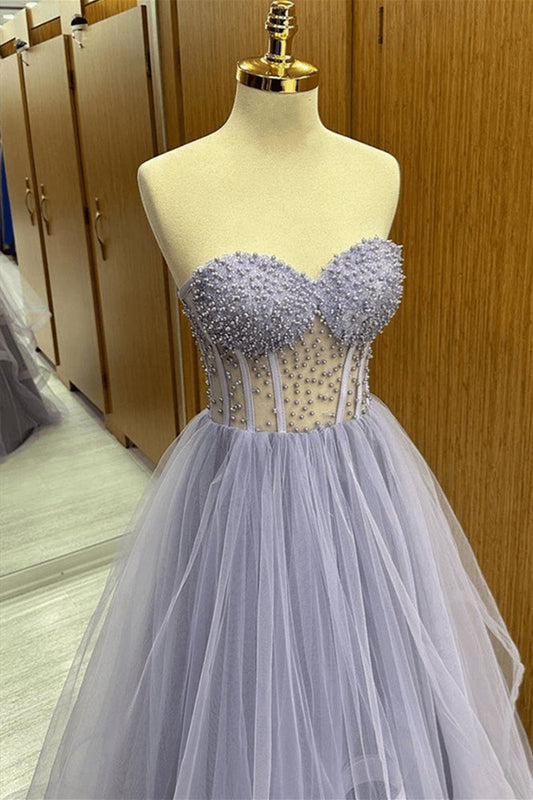 Strapless Beaded Ruffle-Layers Tulle Long Prom Dresses