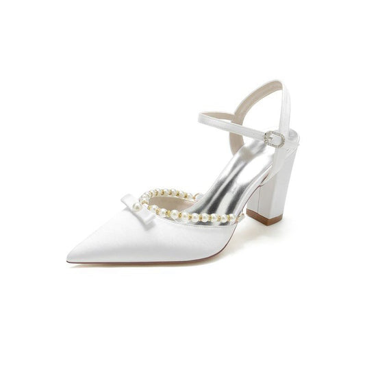Pearl Pointed Toe Ankle Strap Chunky Heels With Bow