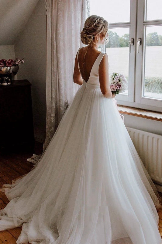 Sleeveless Deep V-back Ethereal Ballgown with Bow And Tulle Wedding Dresses