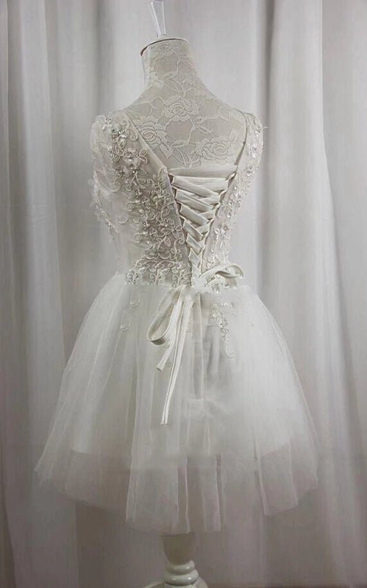 Mini Knee-Length Tulle Lace Dresses with Beading Keyhole Back