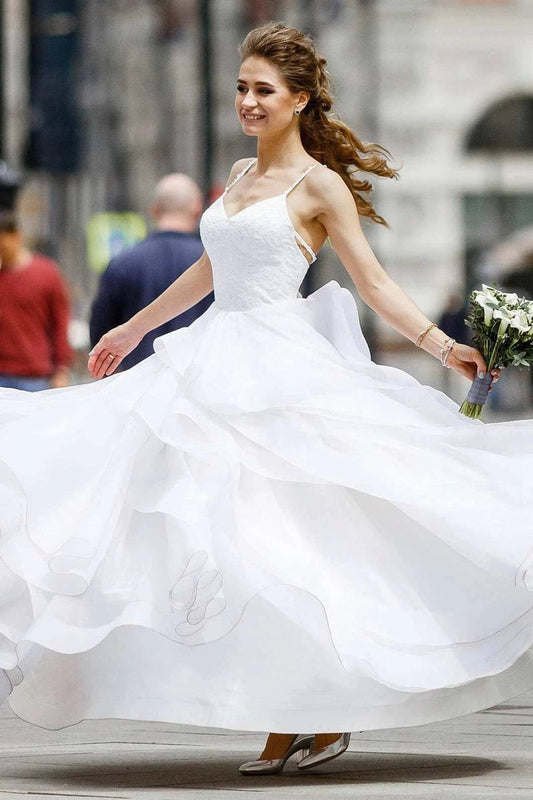 Flowy Spaghetti Layered Wedding Dresses with Lace Top