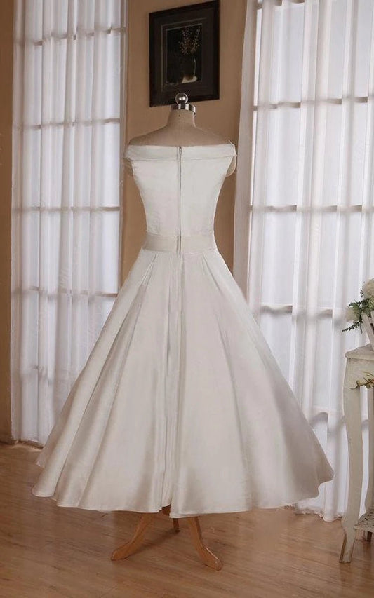 Sleeveless Tea-Length Satin Wedding Dresses with Sash And Off-The-Shoulder Neck