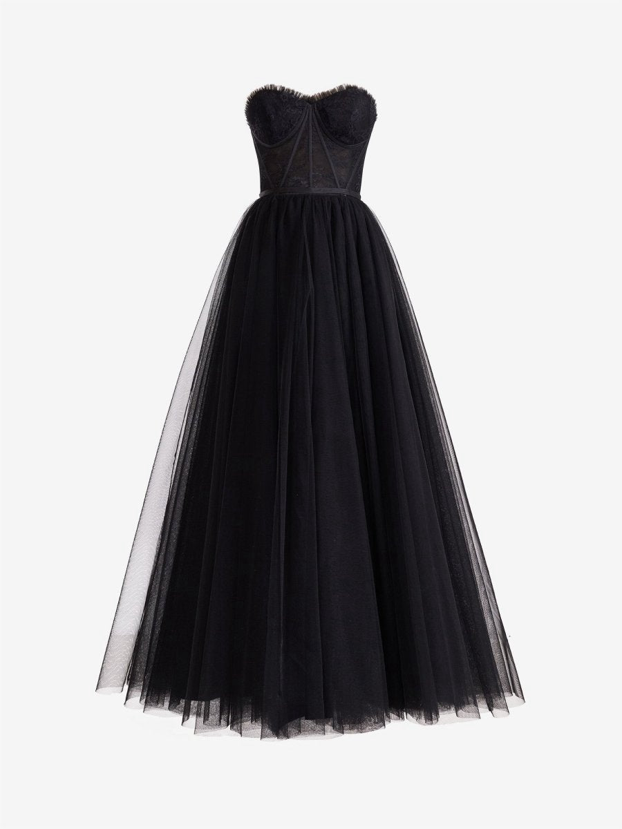 Make a statement of undeniable elegance in it, an A-line tulle prom dress that embodies a seductive blend of classic and contemporary. The sweetheart neckline offers a touch of romance, perfect for capturing the hearts and eyes of everyone in the room. Fabricated from delicate tulle, the dress floats with every step, imbuing you with an air of ethereal grace. The lace corset bodice cinches the waist, elevating your silhouette to a new realm of glamour. With a floor-length cut and an audacious slit, it strikes a balance between modesty and daring, offering a glimpse of leg that will have heads turning.