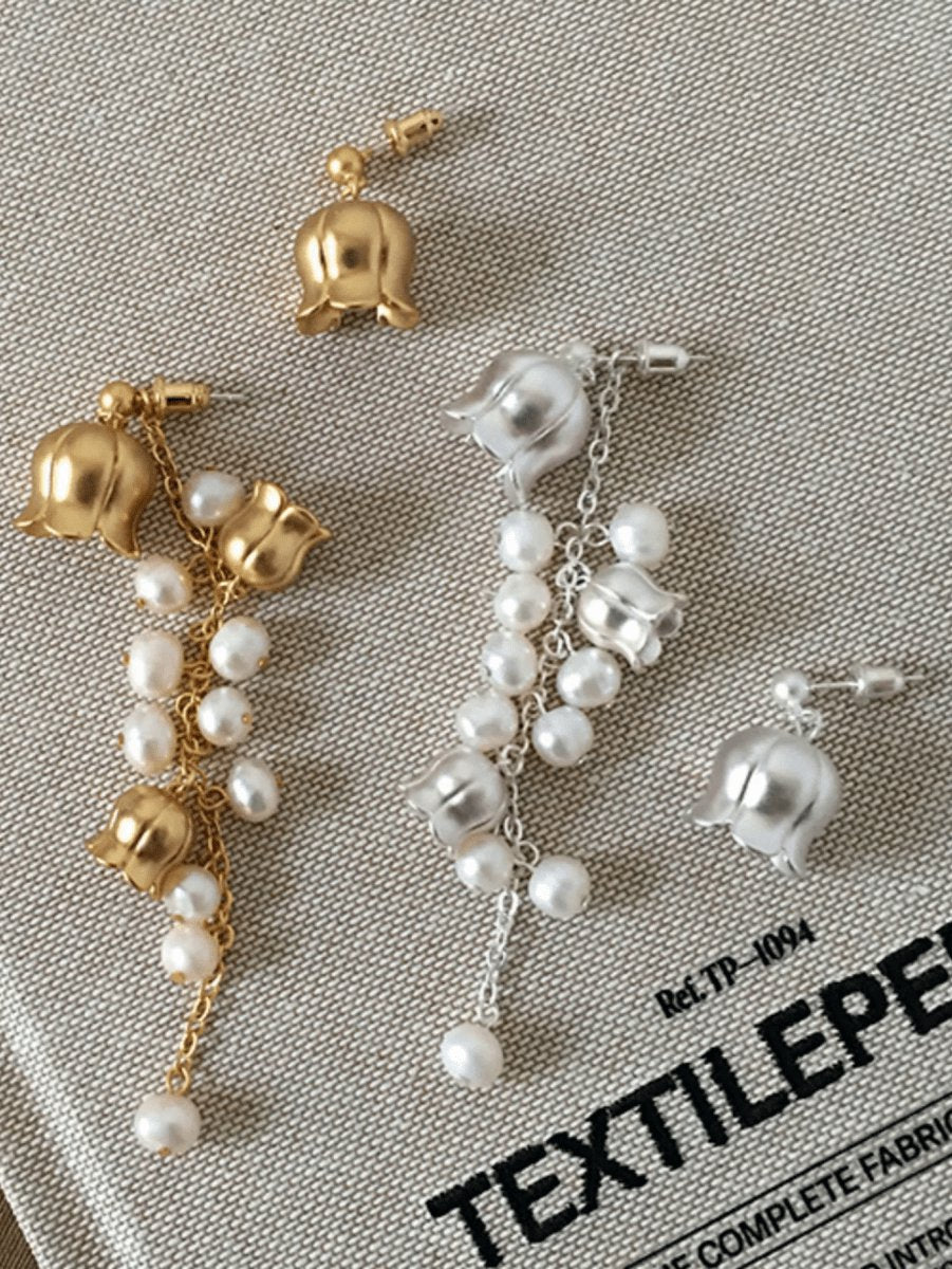 Dressmarkets Asymmetric Tassel Flowers Pearl Long Earrings