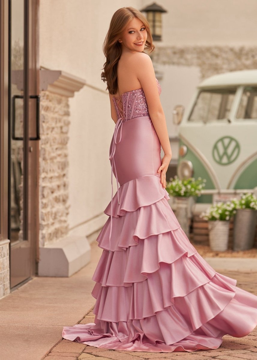 Turn heads in charming mermaid-style strapless pink satin prom dress, designed to make you feel like royalty. The soft satin fabric creates a luxurious, glossy finish that perfectly complements the sleek mermaid silhouette. A strapless neckline and sleeveless design showcase your shoulders and collarbones, while the sweep train adds elegance to every movement. A stylish choice suitable for both evening dresses and formal dresses, highlighted by its delicate appliques, ruffles and a daring slit for a modern yet sophisticated touch. The Lace-up back ensures a customized fit for comfort and style. Ideal for prom or a special party, this dress combines timeless beauty with a contemporary twist.