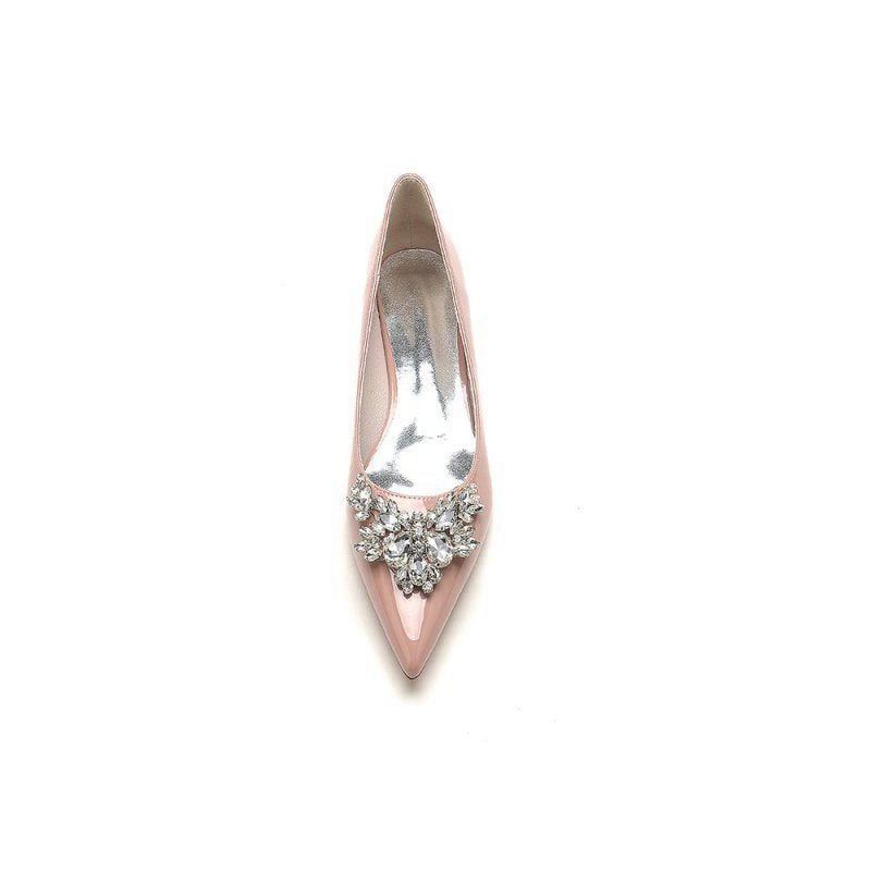 Striking a perfect balance between modern and chic, these light pink pointed-toe flats are an essential addition to any wardrobe. The sleek silhouette and transparent heel section reveal an internal metal structure that adds a touch of luxury to the overall design. The highlight, however, is the large crystal ornament in the shape of a flower or leaf, adorned with transparent and white crystals and golden accents. Whether worn with casual or formal attire, these flats exude elegance and refinement. Plus, the carefully designed heel ensures both stability and comfort, making them perfect for everyday wear. Indulge in sophistication and style with these exquisite flats.