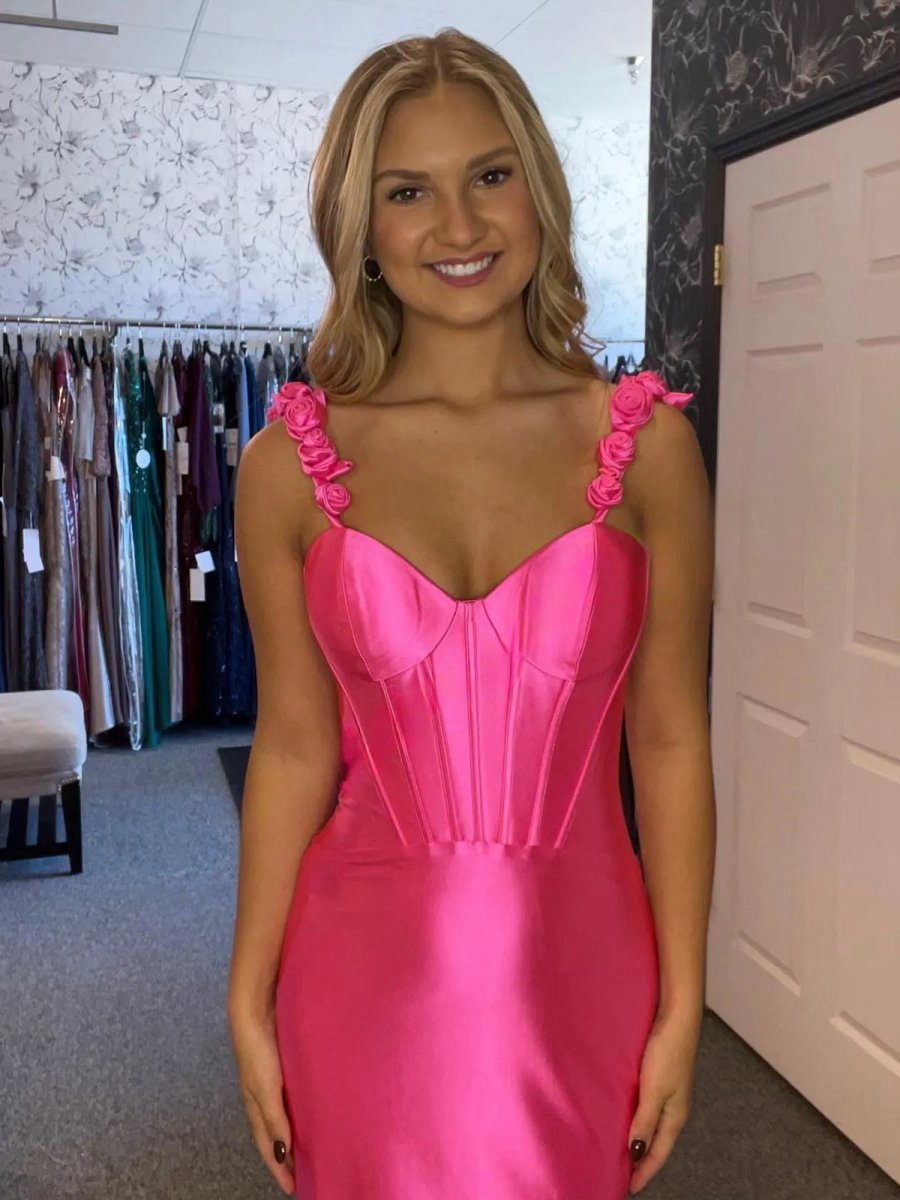 Make a bold entrance in The Hot Pink Floral Straps Mermaid Prom Dress. This stunning dress is crafted from luxurious satin and features a figure-flattering mermaid silhouette that hugs your curves before flaring into a dramatic sweep train. The vibrant hot pink hue exudes confidence, while the sweetheart neckline adds a touch of romance. An ideal choice for both evening dresses and formal dresses, with its delicate floral straps that create a perfect contrast to the smooth satin fabric. The illusion corset design brings an air of sophistication, cinching the waist and enhancing your natural shape, while pleats add texture and dimension to the overall design. Finished with a convenient zipper back, this dress ensures a seamless fit for your special occasion. Perfect for proms, galas, or any event where you want to leave a lasting impression.