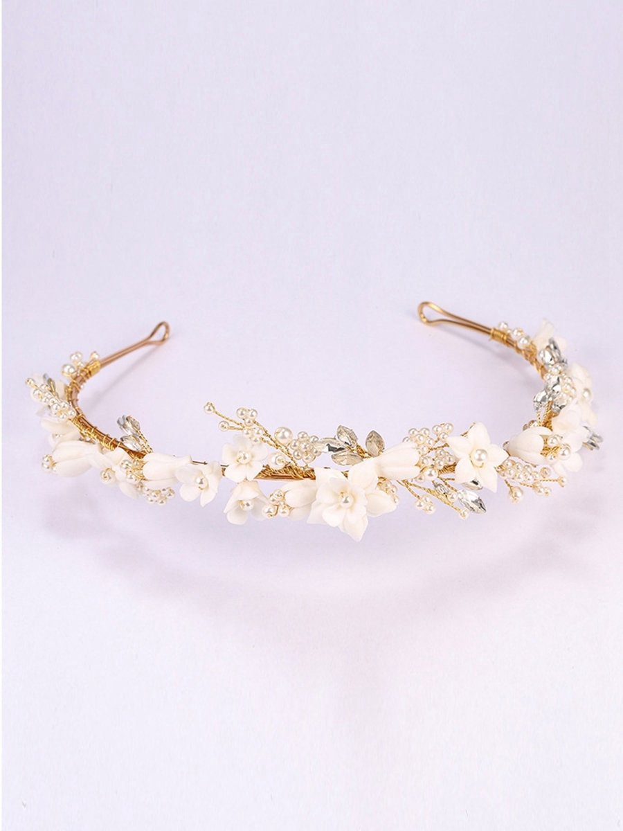 - This enchanting headband effortlessly enhances a variety of bridal hairstyles, from romantic updos to flowing waves. The delicate blooms and pearls delicately frame the face, adding a touch of whimsy and grace to your bridal look.
