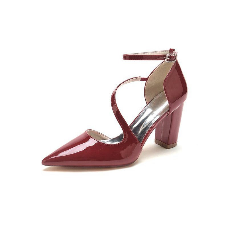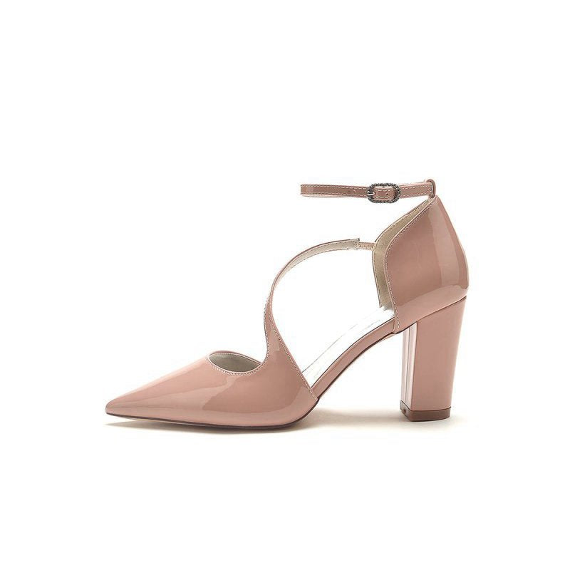 Experience indulgence with these exquisite nude pink Mary Jane heels. Meticulously crafted with a timeless design, these shoes showcase a pointed toe and a delicate cross-strap detail, elevating any ensemble with sophistication. The uniform pink hue boasts a lustrous finish that catches the light, exuding femininity and versatility. Contrasting the pink body, the brown heel adds depth and dimension to the overall look, creating a cohesive and refined aesthetic. Securely fastened by a metal buckle on the vamp, these heels offer a perfect fit and a touch of modern elegance. Elevate your wardrobe with these elegant nude pink Mary Jane heels, a luxurious and stylish choice for any special occasion.