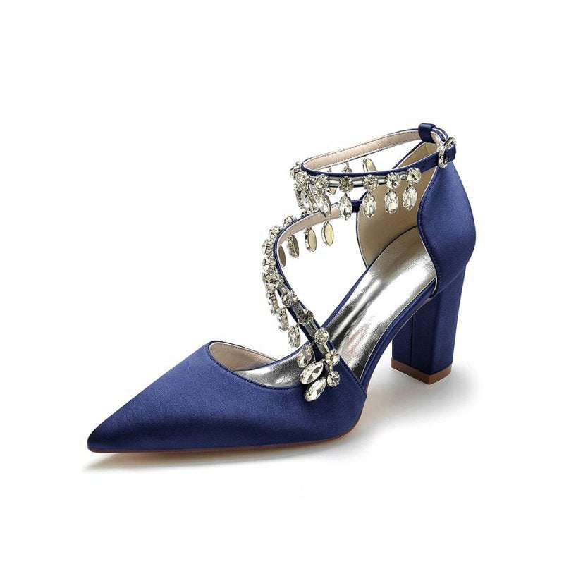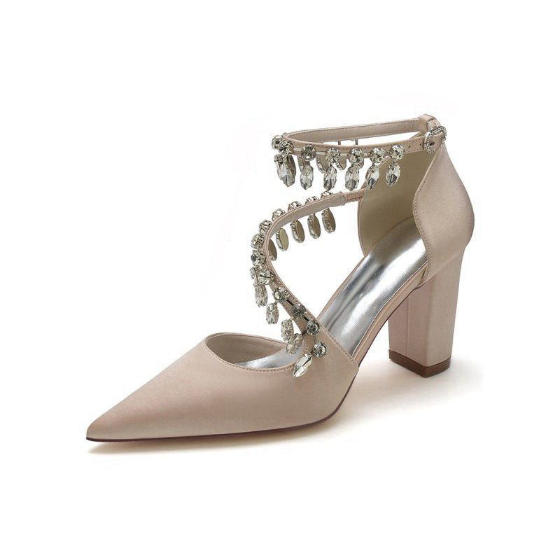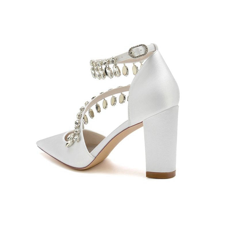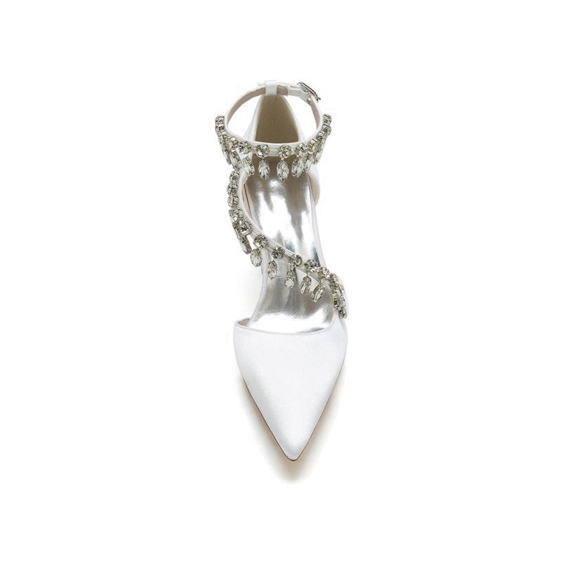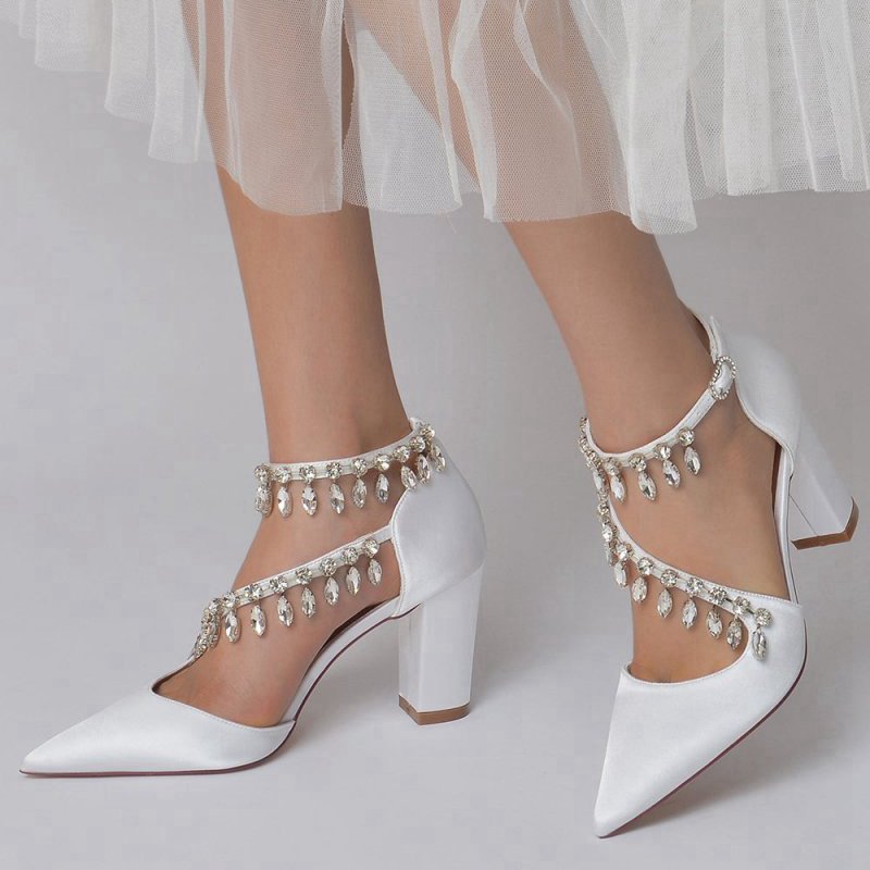 These stunning White High Heels feature a chic chain and crystal accent, perfect for adding sparkle to any look. With kitten heels, a pointed toe, and a slip-on closure, these shoes are ideal for prom shoes, wedding shoes, evening shoes, party shoes, or bridesmaid shoes. Made with satin fabric, artificial leather lining, and a rubber sole, they are perfect for any occasion.