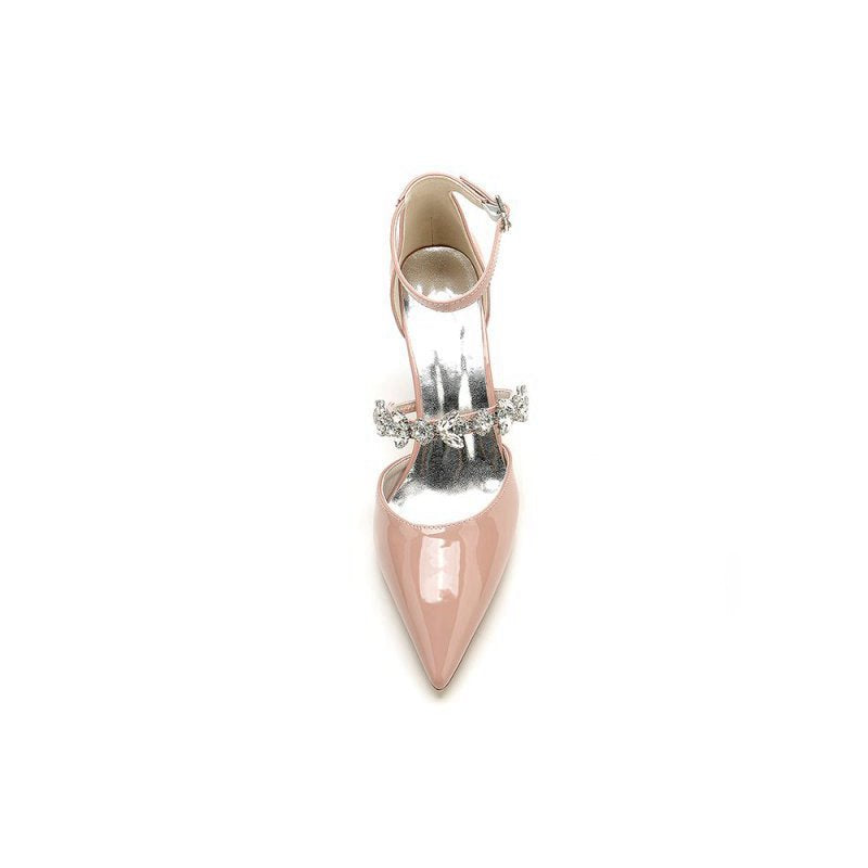 Elevate your elegance and sophistication with these exquisite nude pink high heels. Skillfully crafted from smooth, glossy leather, these shoes embody a sense of luxury and modernity. The design is nothing short of stunning, featuring a pointed toe that elongates and adds a sleek, stylish touch to any outfit. Delicately thin straps wrap around the ankle and are adorned with a dazzling crystal accent at the top that resembles a piece of exquisite jewelry. The thin, metallic silver heel complements the pink leather beautifully and provides stability and support while making a bold fashion statement. Set against a pristine white background, these heels are a true showstopper and pair effortlessly with anything from elegant dresses to chic trousers. Make a lasting impression and stand out in these elegant nude pink high heels.