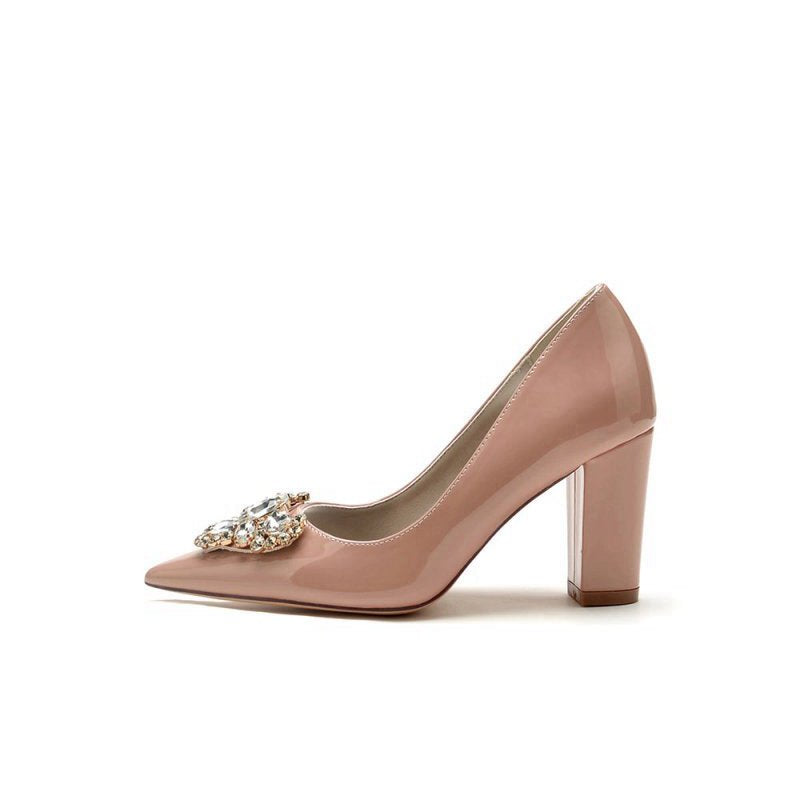 Indulge in unparalleled elegance and sophistication with these exquisite pink high heels. Meticulously crafted from luxurious and lustrous pink leather, these pointed-toe shoes elongate the legs, adding a touch of grace and class to any ensemble. The front features a lavish golden buckle adorned with a stunning collection of transparent and vibrant gemstones, adding a dazzling touch to the overall aesthetic. The sturdy and supportive heel is cleverly designed in a rich brown hue, perfectly complementing the pink leather and creating a cohesive and visually striking look. Against a pristine white backdrop, these pink high heels are guaranteed to captivate and leave a lasting impression. Versatile and chic, they pair effortlessly with a variety of outfits, from elegant dresses to sophisticated trousers, ensuring you make a statement wherever you go.