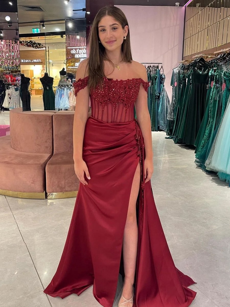 Off the Shoulder Satin Beaded Prom Dresses with Appliques