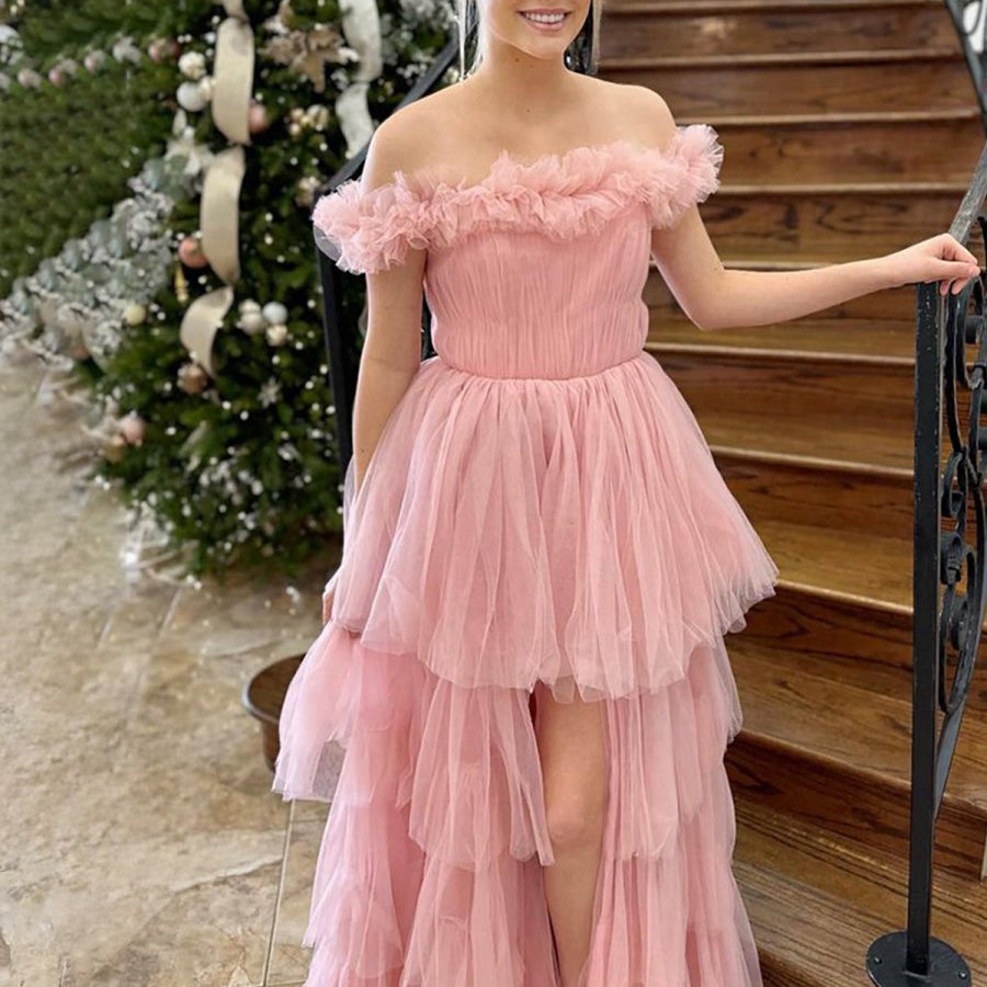 This Pink Off-The-Shoulder Tulle A-Line Prom Dress combines romance and sophistication in a stunning design that's sure to turn heads. The soft tulle fabric drapes beautifully in an A-line silhouette, creating a flattering and timeless shape that enhances your natural beauty. The floor-length design adds a regal touch, while the off-the-shoulder neckline brings a sense of grace and femininity to the look, showcasing your shoulders and collarbones. The sleeveless style ensures an elegant and airy feel, while the daring front split adds a modern twist, allowing you to move with confidence and flair. The Lace-up back not only provides a customizable fit but also adds a subtle hint of allure as it laces up to perfection. This pink dress is a blend of elegance and playfulness, the ideal pick for both chic evening dresses and sophisticated formal dresses.