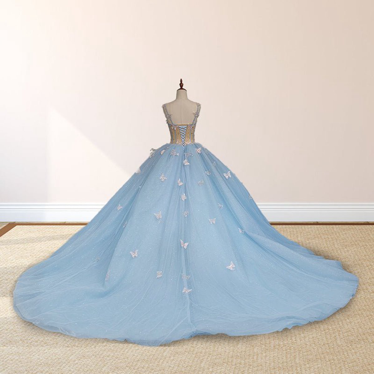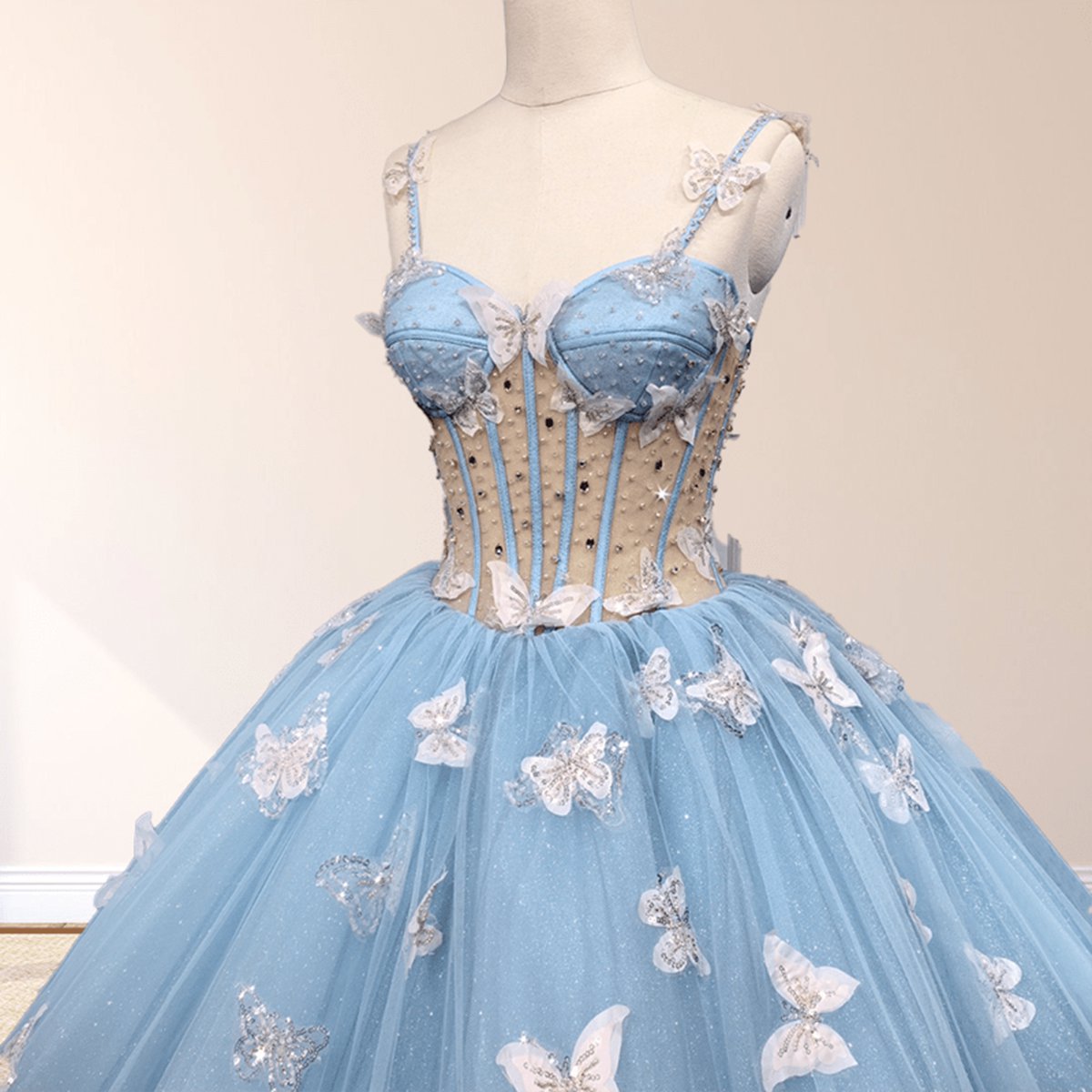 Embrace the beauty of nature and elegance with this Quinceanera Dress Spaghetti Straps Beading with 3D Butterfly Appliques. This breathtaking gown features a soft sky blue color that exudes serenity and charm. It is crafted from layers of ethereal tulle fabric that move gracefully as you dance and celebrate. The spaghetti strap neckline gives a modern and youthful touch, beautifully framing the shoulders while the sleeveless design allows for maximum freedom and comfort. The corset back ensures a secure and flattering fit, offering flexibility and style throughout the evening. What truly sets this dress apart is the exquisite 3D butterfly appliques, delicately placed across the bodice and skirt, adding an enchanting, whimsical effect. The gown is further enhanced with sequins and beadings, which catch the light and provide a touch of sparkle and glamour. This Quinceanera Dress is perfect for a girl who wants to celebrate in both beauty and style.