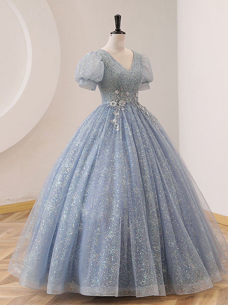 Step into an evening of elegance and grace with this Quinceanera Dress V Neck Tulle Sequin Gray Blue Long Prom Dress. The A-line silhouette creates a flattering and classic shape, offering a perfect balance of volume and fluidity with the tulle fabric that moves beautifully as you dance. The gray-blue color exudes a serene and timeless appeal, adding a soft, ethereal quality that's perfect for formal occasions. The V-neckline highlights your collarbone and shoulders, offering a modern and feminine look, while the short sleeves add a delicate, sweet touch, making it both comfortable and chic. The intricate appliqued details on the bodice are complemented by sparkling beading, giving the dress an enchanting shimmer that catches the light with every step. The Lace-up back ensures a customizable, secure fit, allowing you to feel confident and beautiful throughout your celebration. Whether you're celebrating your quinceanera, attending prom, or any formal event, this dress promises to make you feel like the star of the evening.