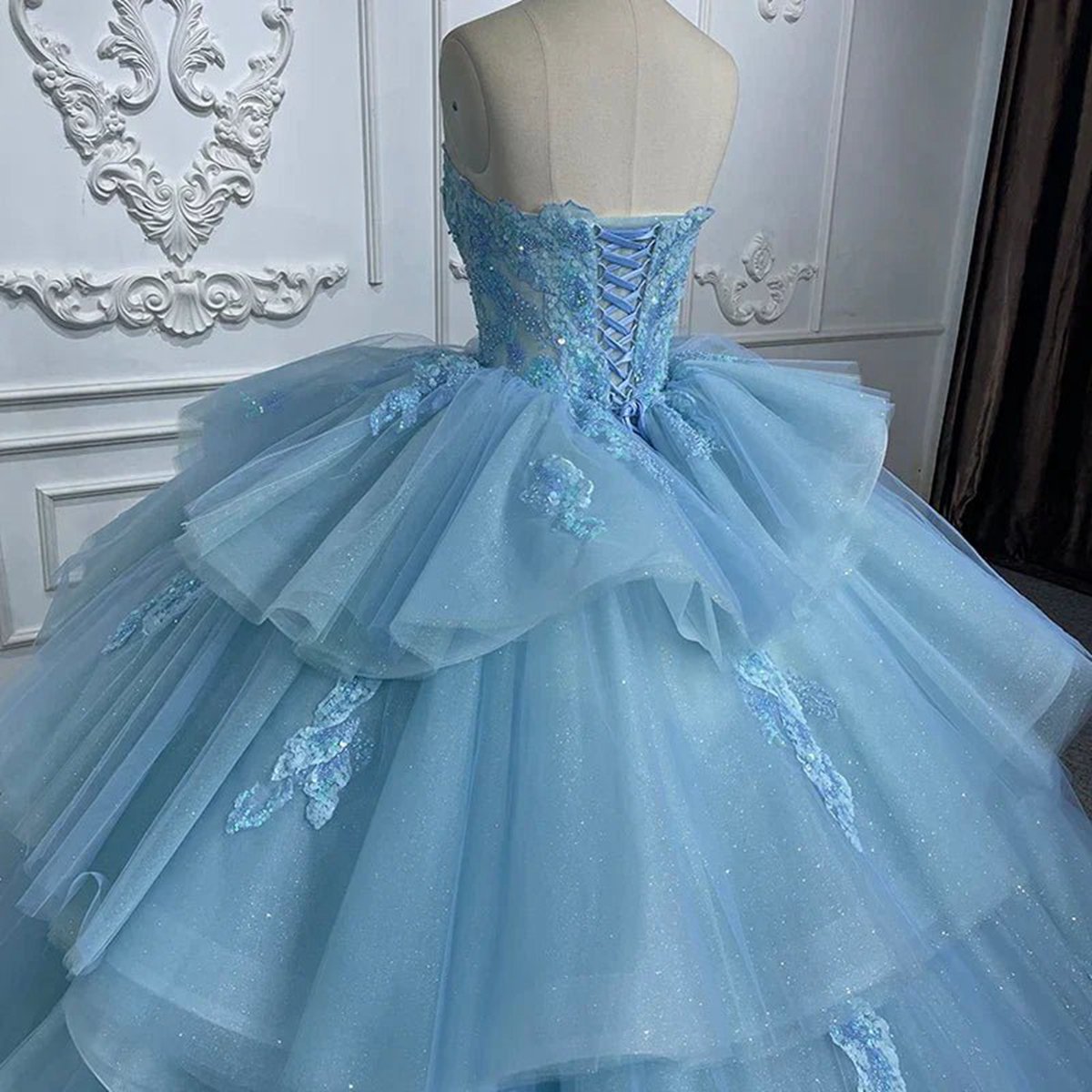 Step into a fairytale with this romantic princess quinceanera dress. This enchanting dress is made from delicate lace fabric in a dreamy sky blue color. The strapless neckline and sleeveless design create an elegant look, while the cathedral train adds a touch of grandeur to this dress. With the appliqued details and ruffled embellishments, this gown is perfect for making your quinceanera celebration unforgettable.