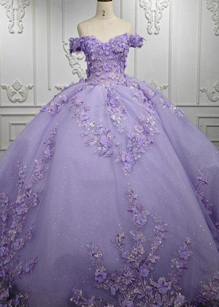 This Romantic Quinceanera Dress is the epitome of timeless elegance and dramatic flair. Its stunning ball gown silhouette is made from luxurious lace fabric that adds both texture and romance. The dress features a breathtaking off-the-shoulder neckline, adding a touch of sophistication to the sleeveless design. Its delicate 3D flower appliques gracefully embellish the bodice and flow down into the voluminous skirt, creating a captivating visual effect. The cathedral train ensures a grand entrance, perfect for making a statement on your special day, while the Lace-up back allows for a customizable fit, ensuring you feel as confident as you look. This dress is ideal for quinceanera celebrations or any event where you want to shine with elegance and beauty.