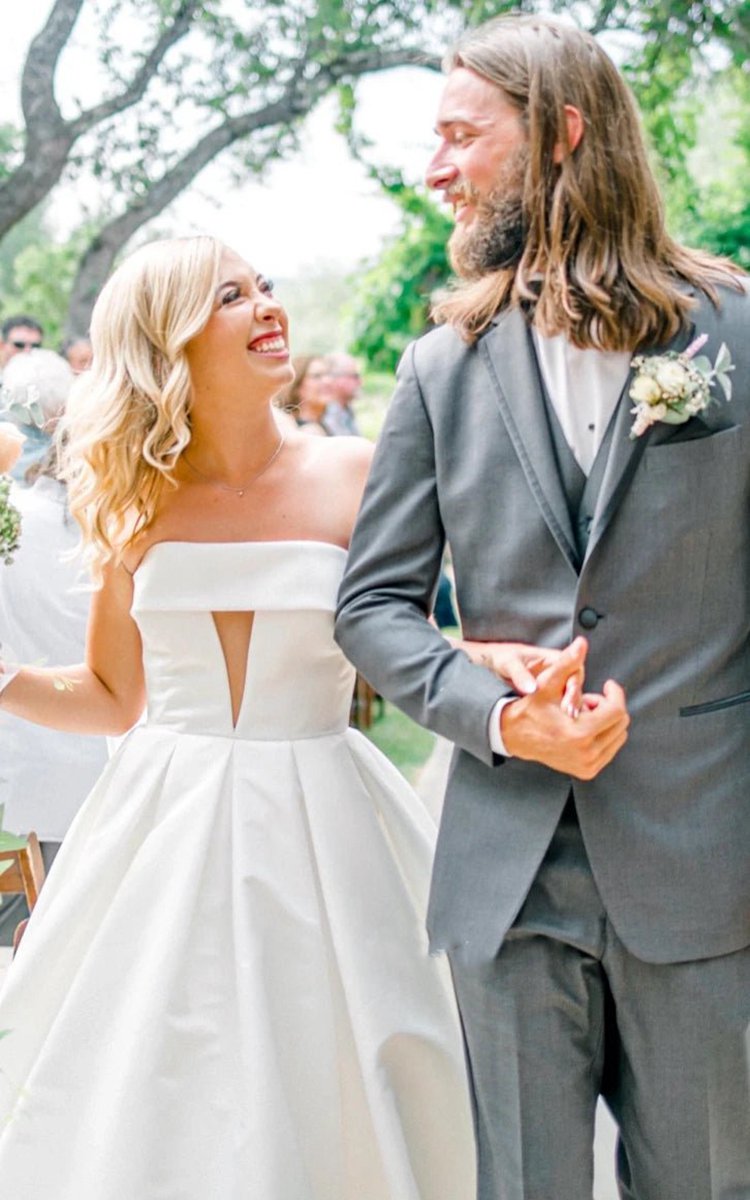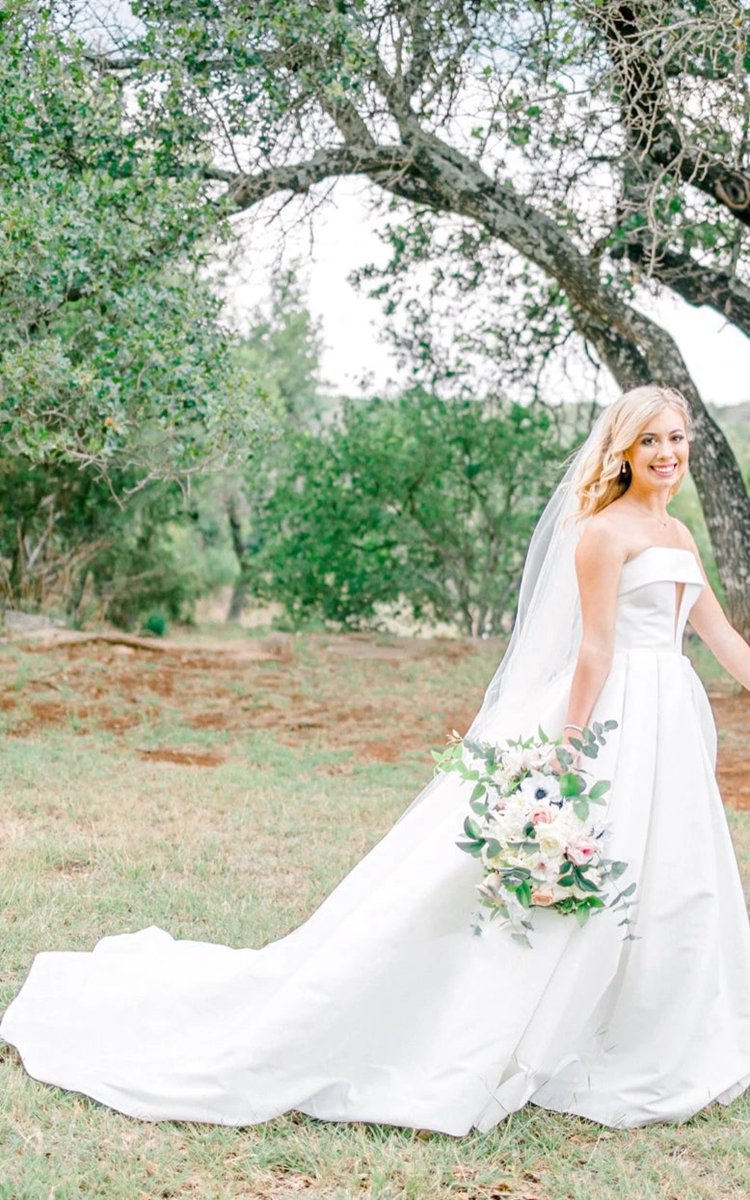 Dressmarkets Satin A-line Strapless Beach Elegant Wedding Dresses with Button Back And Chapel Train