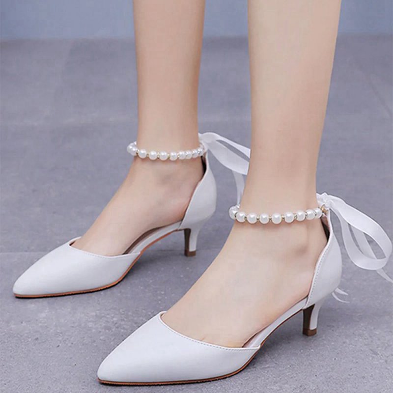 Add a touch of glamour to your next event with the Satin Pearl Ribbon Tie Pointed Toe Ankle Strap High Heels. These elegant heels feature a sleek satin upper adorned with ribbon ties and faux pearls, creating a luxurious and sophisticated look. The pointed toe and stiletto heel offer a chic silhouette, while the one-strap buckle ensures a secure and adjustable fit. These heels combine timeless style with modern flair, perfect for proms, parties, or any formal occasion.