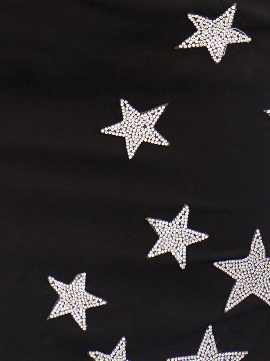 The dress is a seamless fusion of modern glamour and timeless style. This sheath-style attire flawlessly contours your form, delivering a chic look that's hard to resist. Its exquisite stretch satin fabric not only radiates opulence but promises a fit that accentuates your curves with grace. The strapless neckline lends an air of sultry sophistication, complemented by the sleeveless cut that showcases your arms beautifully. As you move, the star-pattern beading shimmers under the light, harmonizing with the beaded fringes on the side slit that add an edgy twist to the look. Secured with a Lace-up back, The ensures you're draped in comfort all evening.