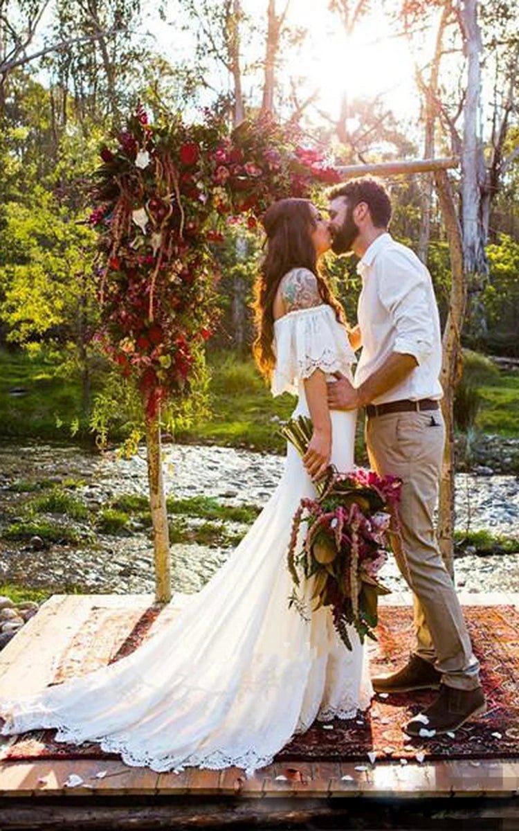 Dressmarkets Short Sleeve Lace Boat Neck Appliques Court Train Bohemian Wedding Dresses