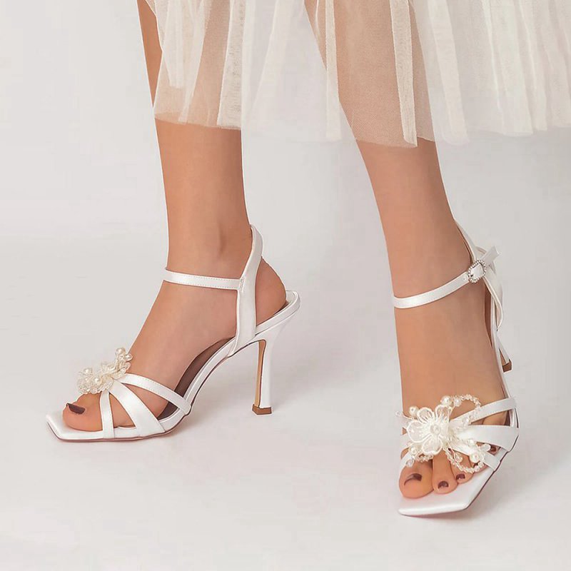 Dressmarkets Square Toe Floral Beaded Ankle Strap High Heels