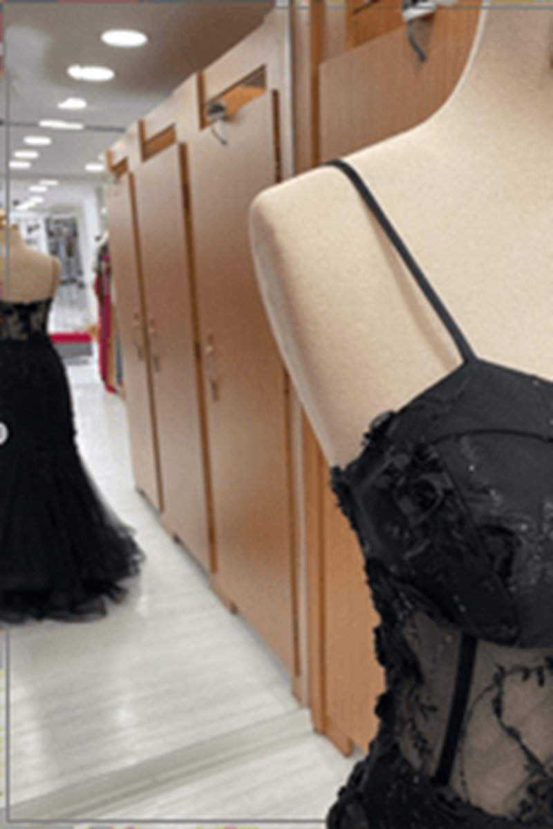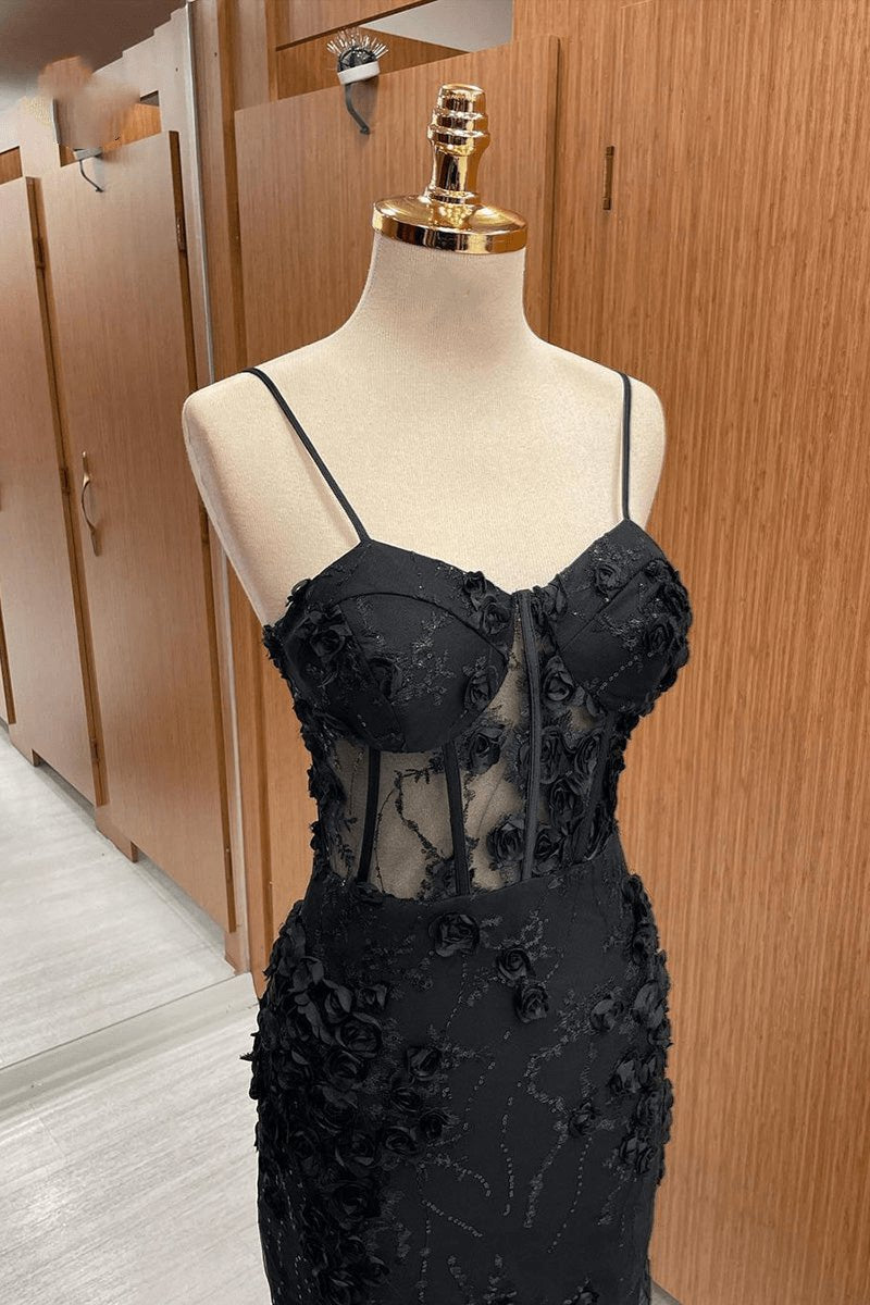 Embrace the night in it, a mesmerizing black mermaid prom dress that flawlessly fuses classic charm with modern elegance. Crafted from exquisite organza fabric, this gown is a true testament to timeless sophistication. Featuring a delicate spaghetti-strap sweetheart neckline, it offers both support and style, ideal for a night of celebration. An ideal choice for both evening dresses and formal dresses, with its sleeveless design complementing the figure-hugging mermaid silhouette, which gracefully cascades to a floor-length sweep train, ensuring a dramatic entrance. It is adorned with an illusion corset bodice and intricate lace appliques, adding a touch of romance and intricacy to this enchanting ensemble.