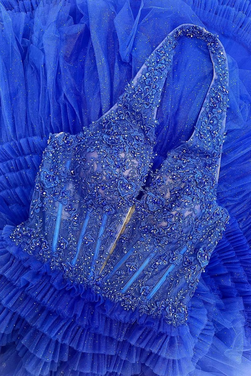 - Embellishment: Lace Appliqued, Slit, Multi-Tiered Ruffles
